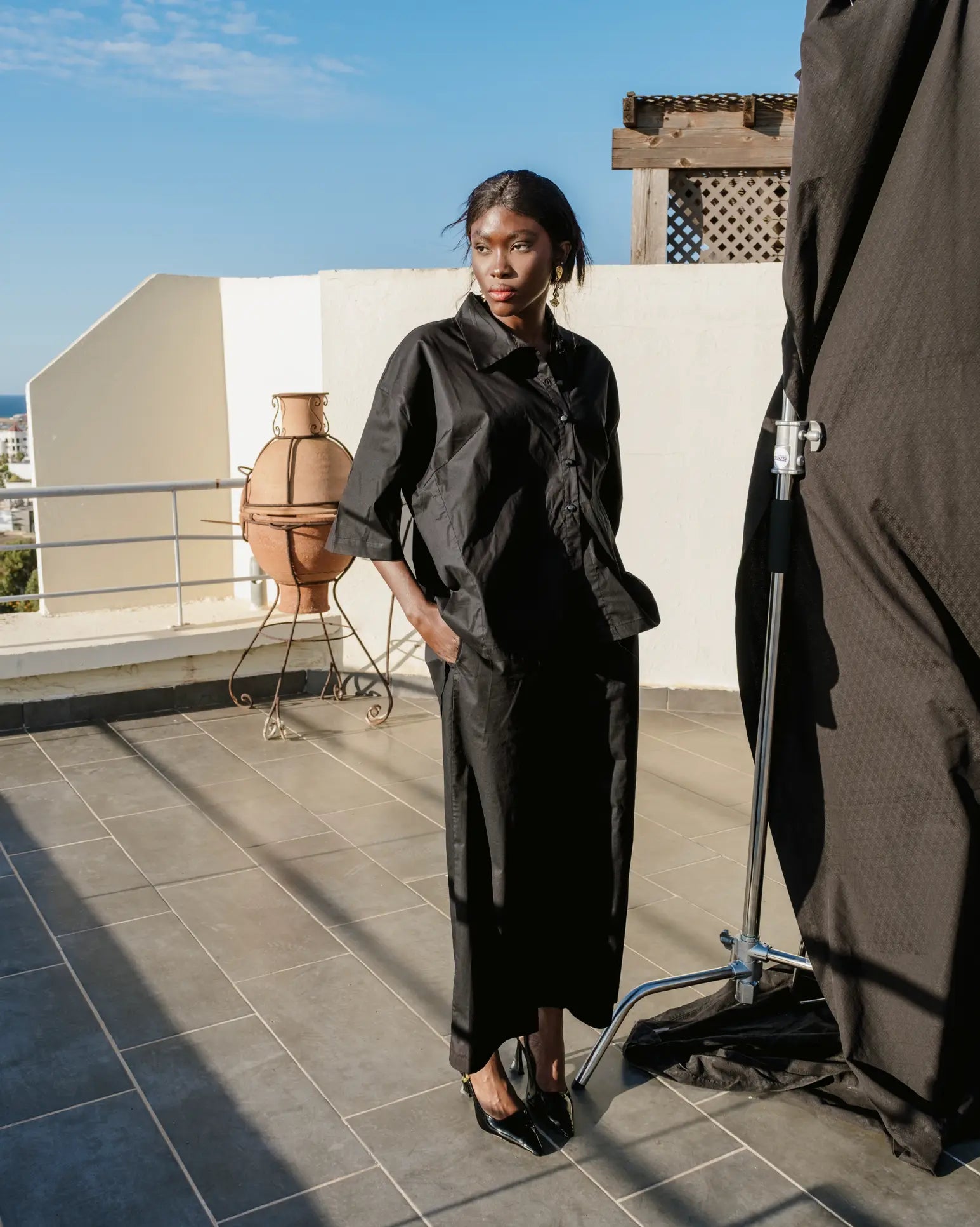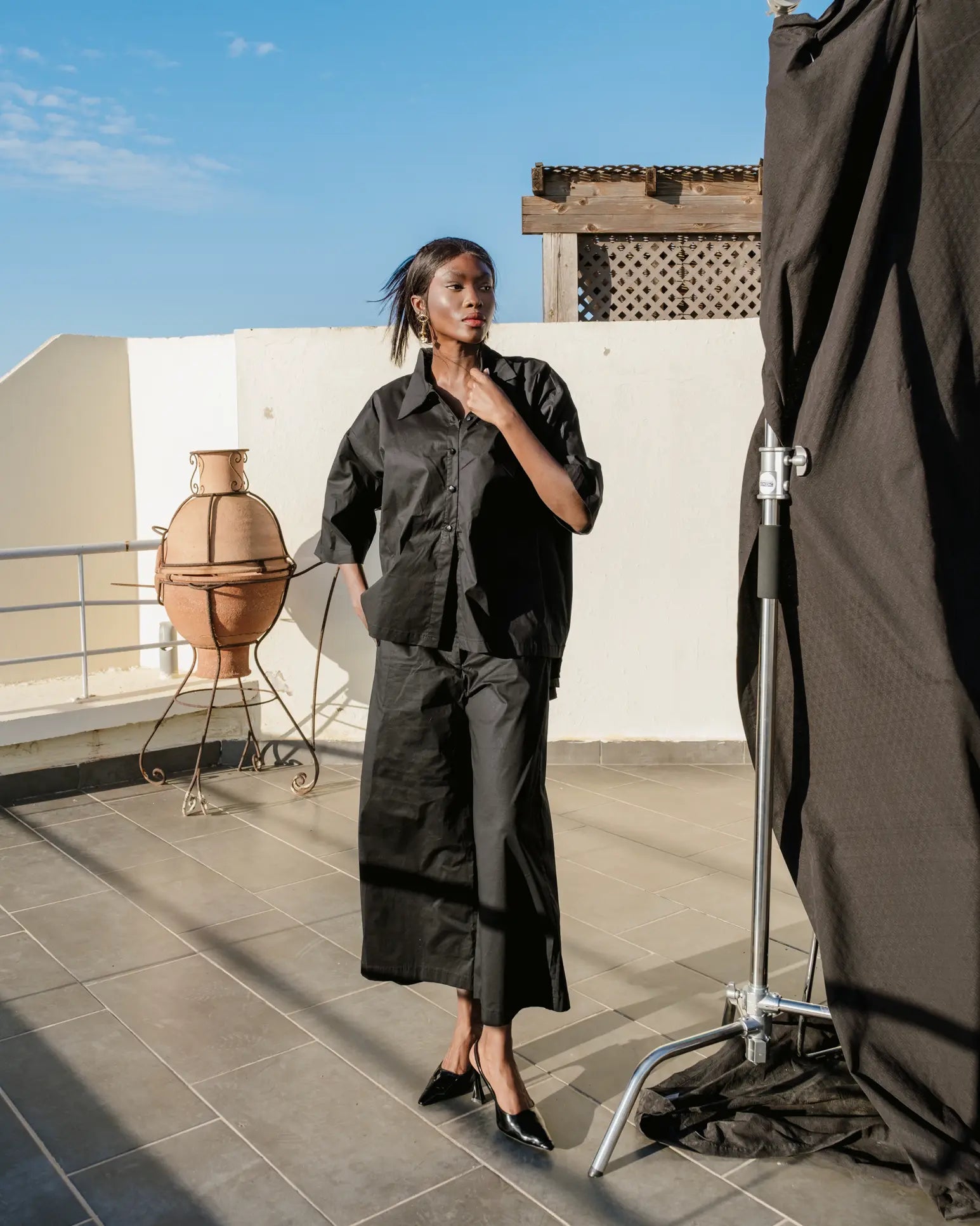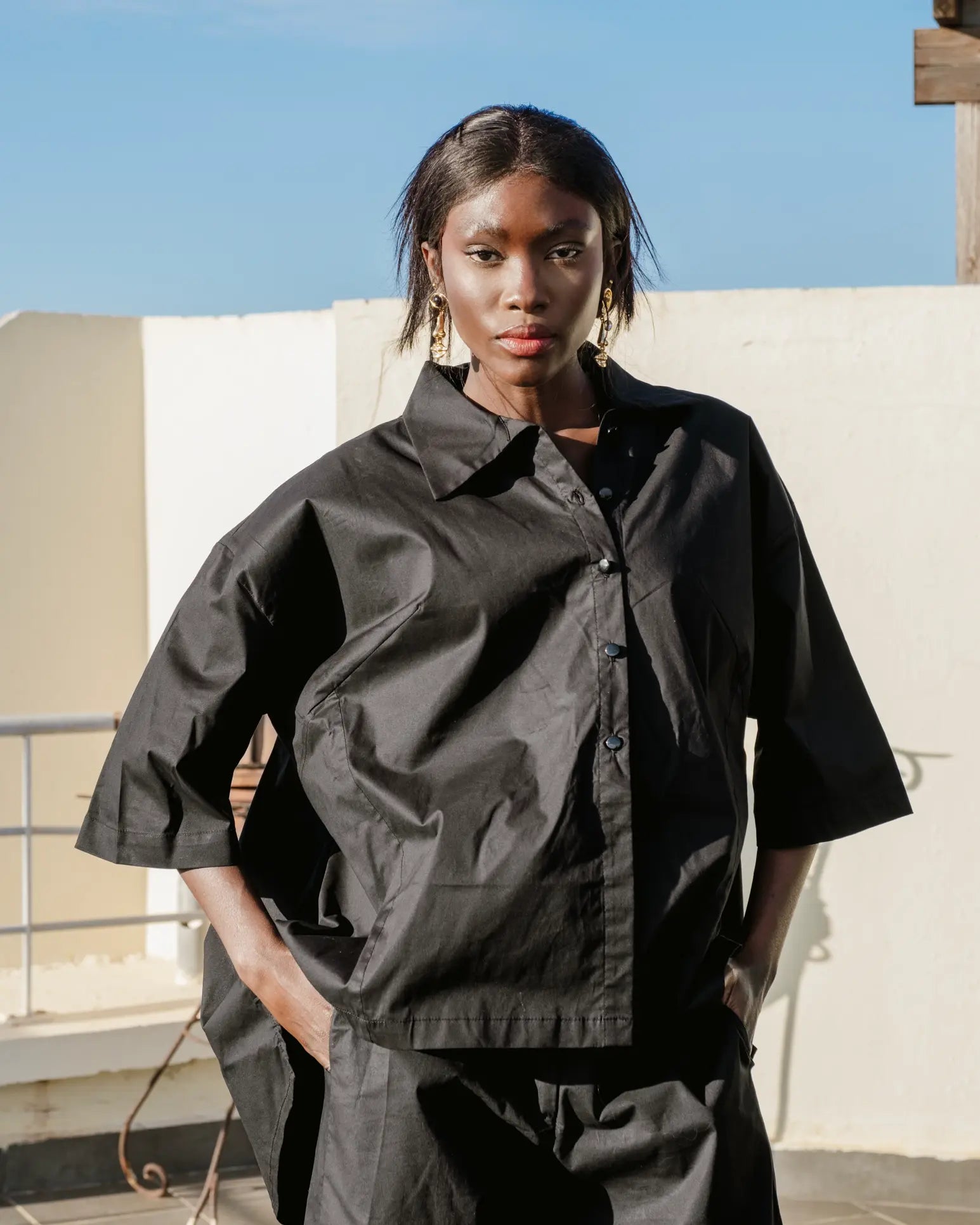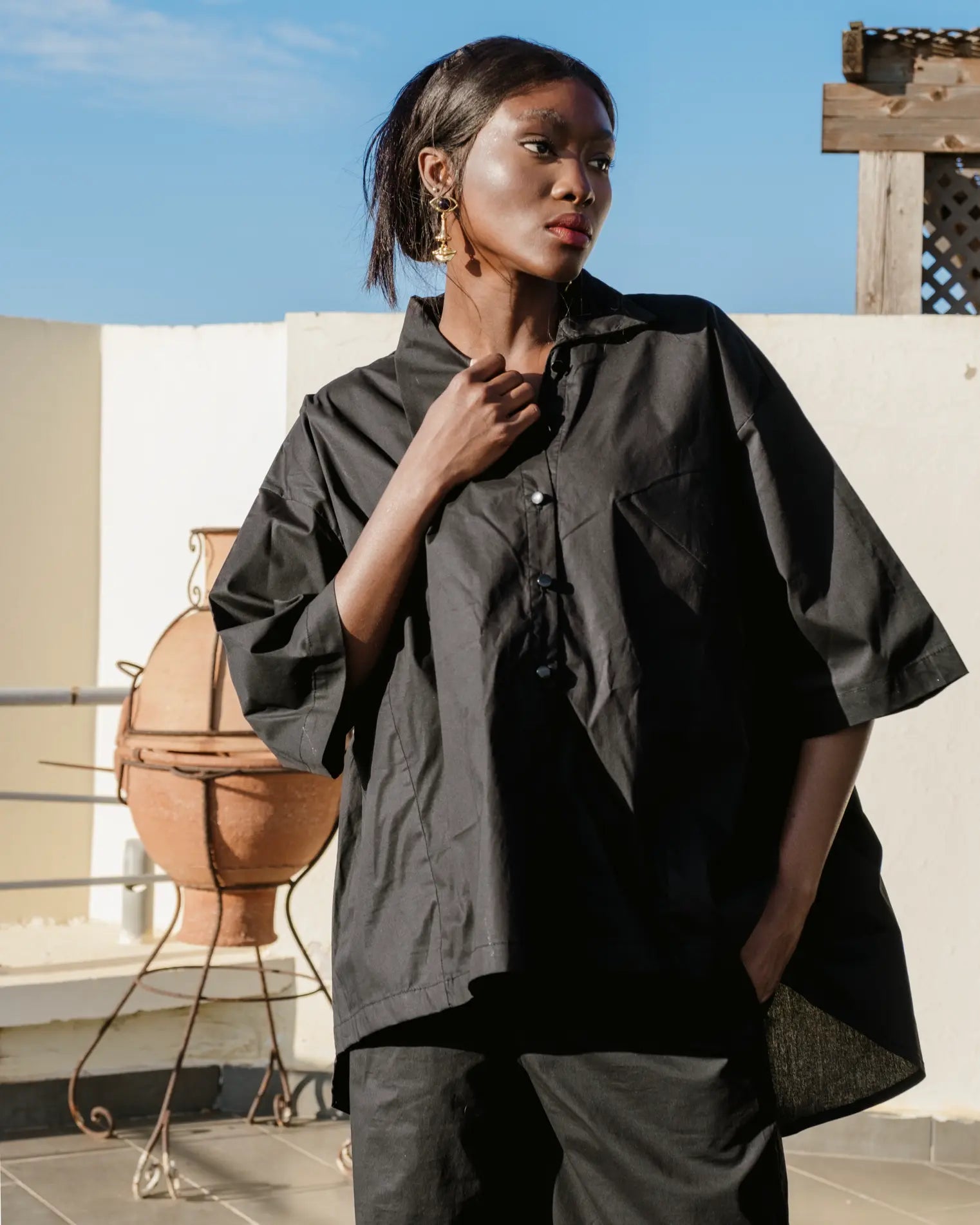 Ensemble chemise et pantacourt oversize en coton/popeline noire.