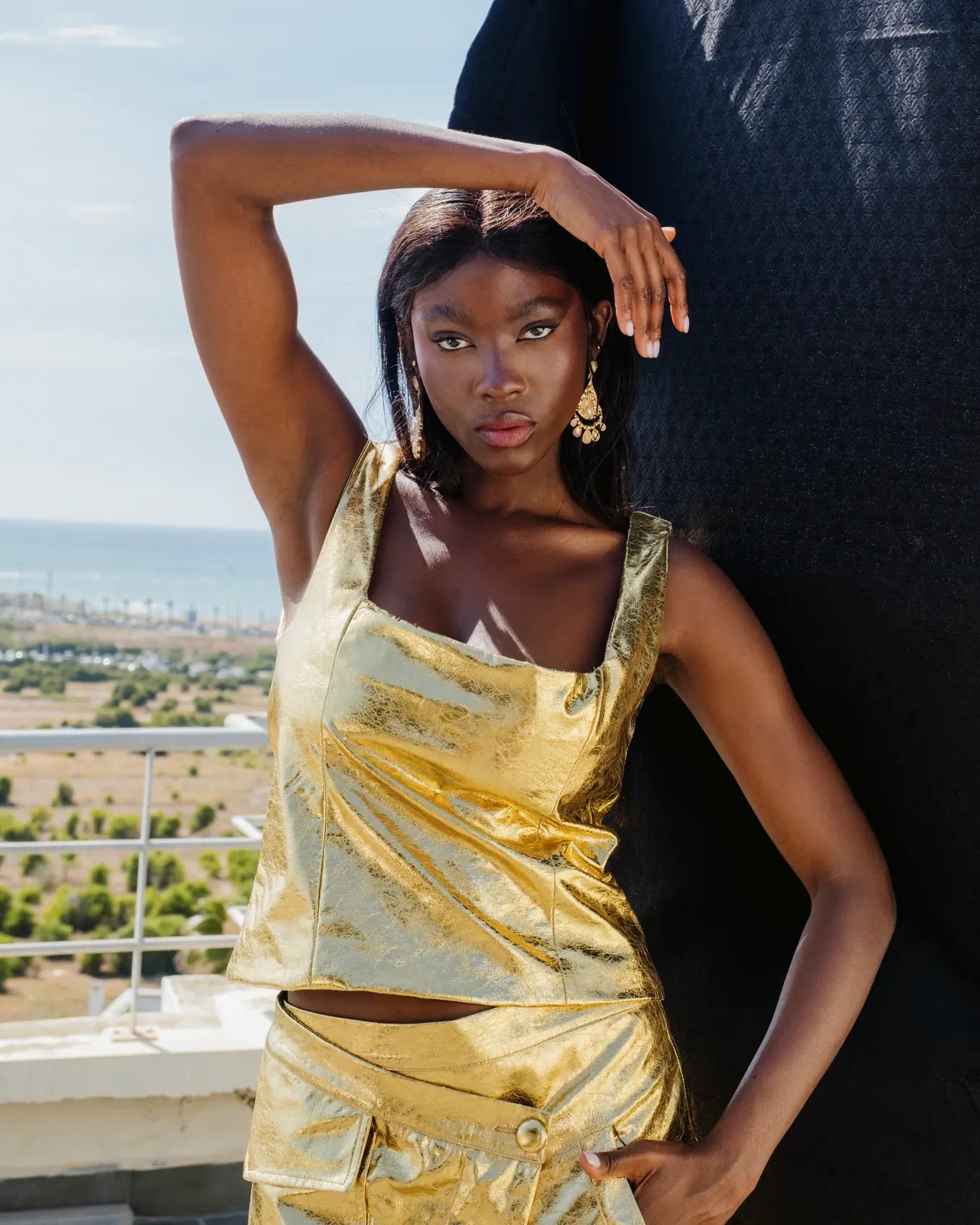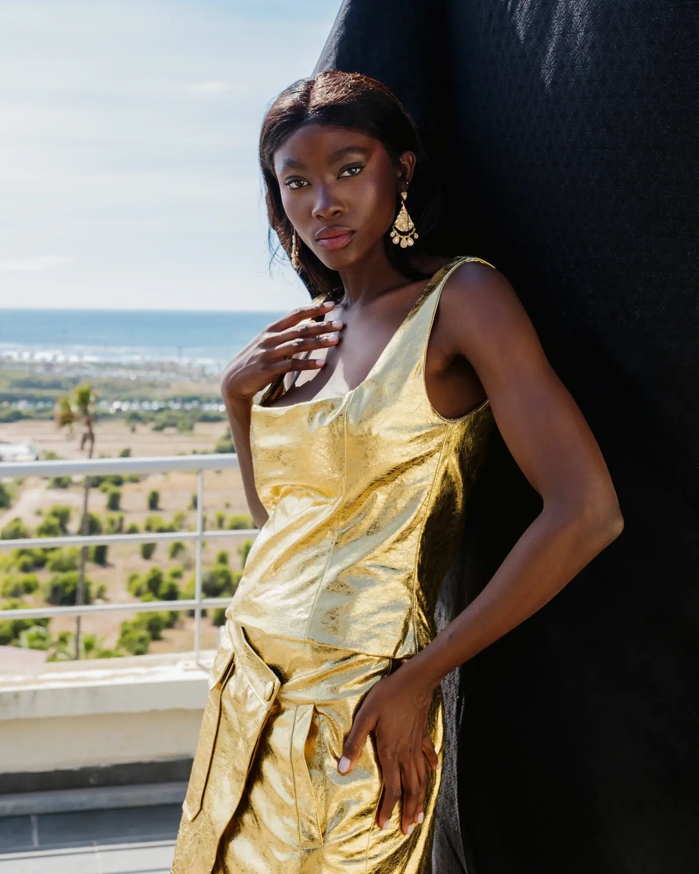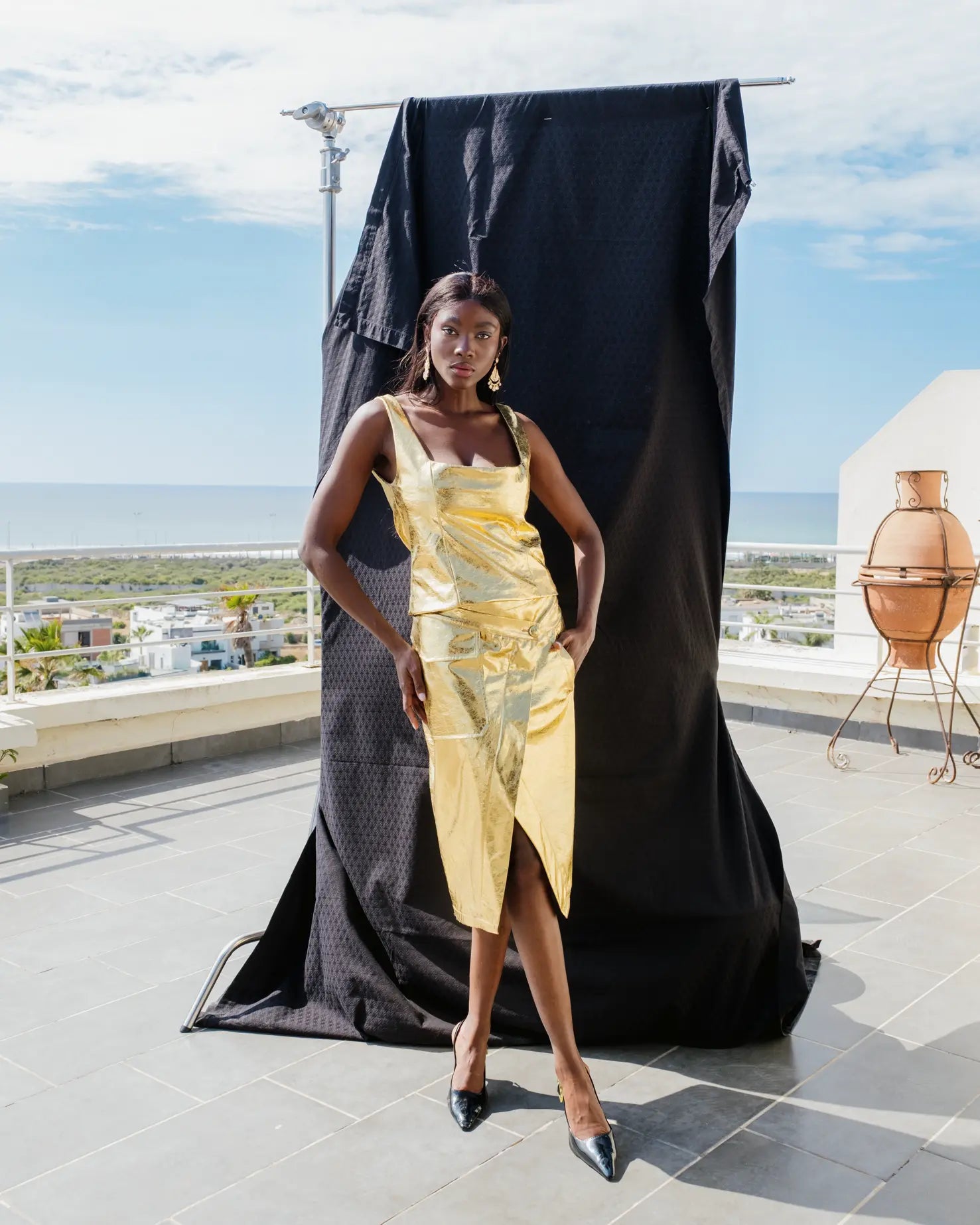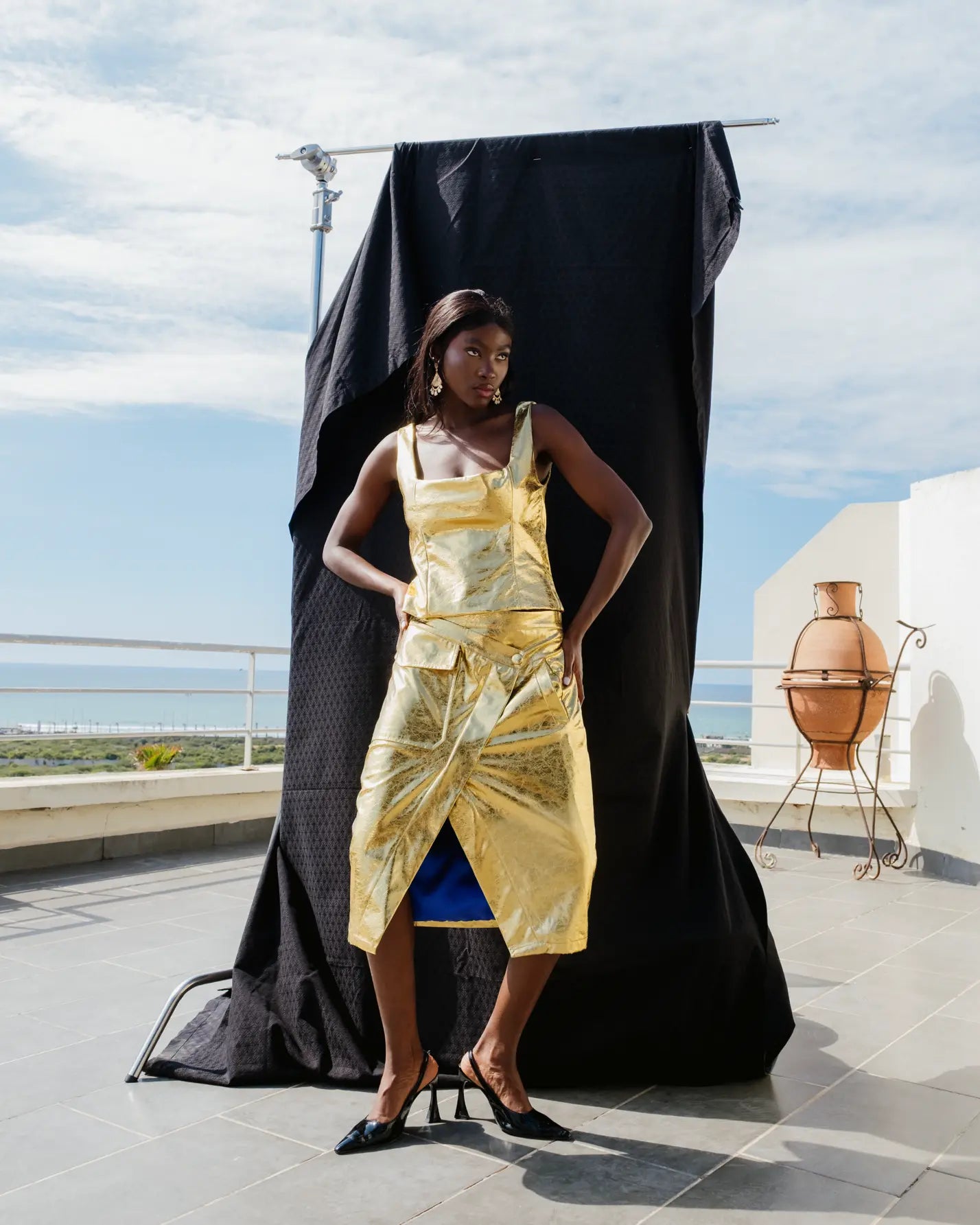 Jupe asymétrique avec poches latérale, doublure bleu roi.